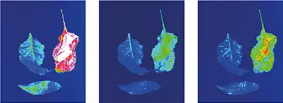 Multispectral imaging example with intact leaf (left) dead dry leaf (right) and stress-damaged leaf (bottom)