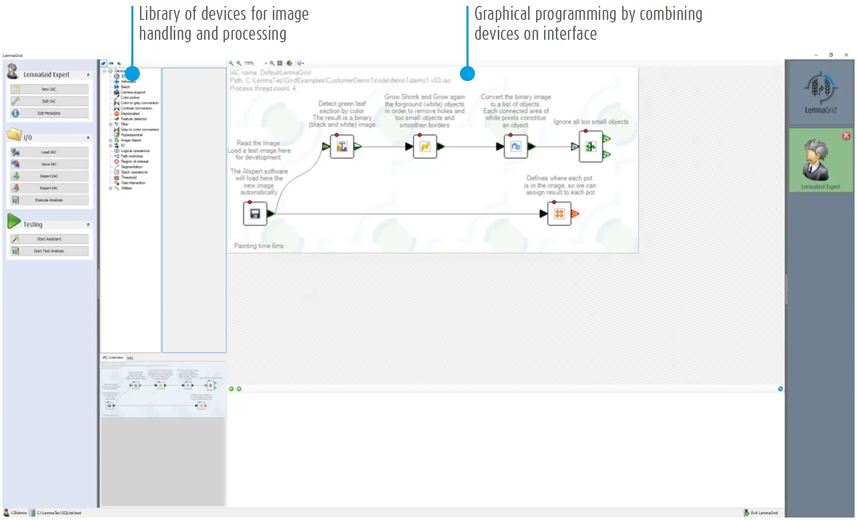 The LemnaGrid app uses an intuitive graphical programming environment, which allows for easy integration of different image analysis algorithms. LemnaGrid phenotyping software offers high flexibility for user programming. The image processing pipeline extracts desired properties/features from the original image and stores results in a dedicated storage system. LemnaGrid can include functions of state-of-the-art machine learning tools, next to standard image analysis to detect and extract features of interest. Guided by the LemnaGrid graphical user interface, users can build their own analytical pipeline with pre-defined devices.